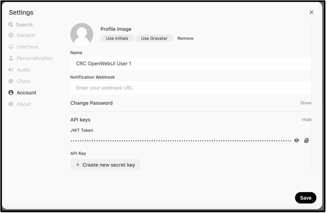 Step 1: Obtain your API key from Settings > Account on the CRC Hosted Open WebUI application