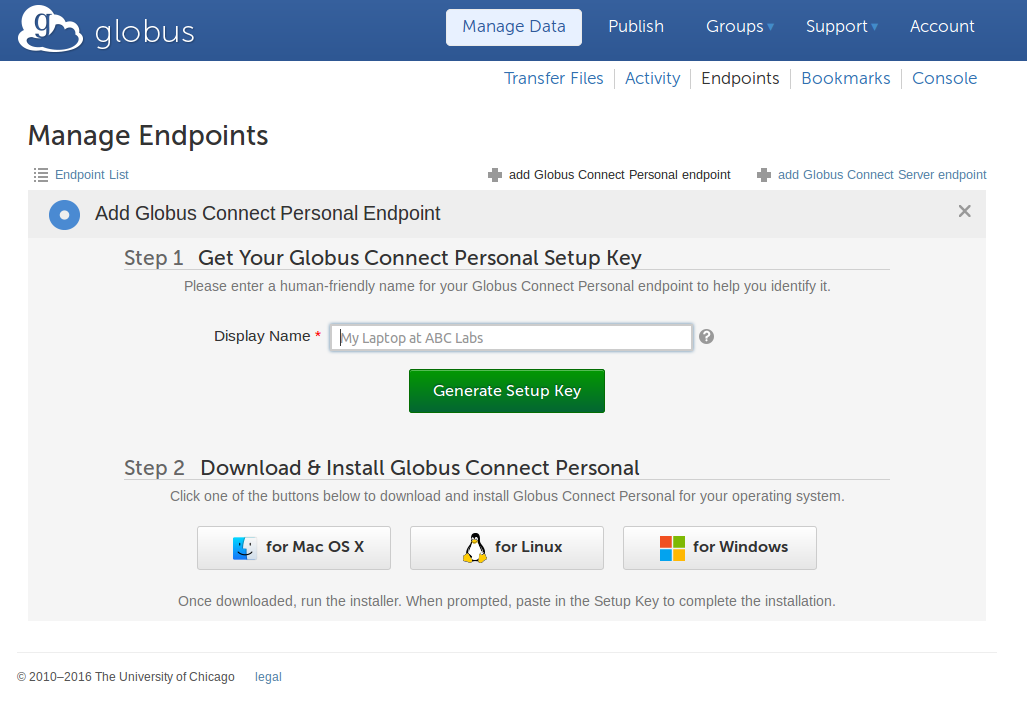 Once Globus Connect Personal is installed on your system, you will need to create a endpoint from your Globus account.